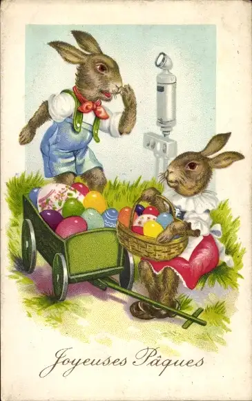 Ak Glückwunsch Ostern, Vermenschlichte Hasen mit Ostereiern