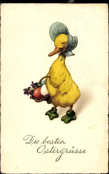 Ak Glückwunsch Ostern, Vermenschlichtes Küken mit Haube und Ostereiern im Korb