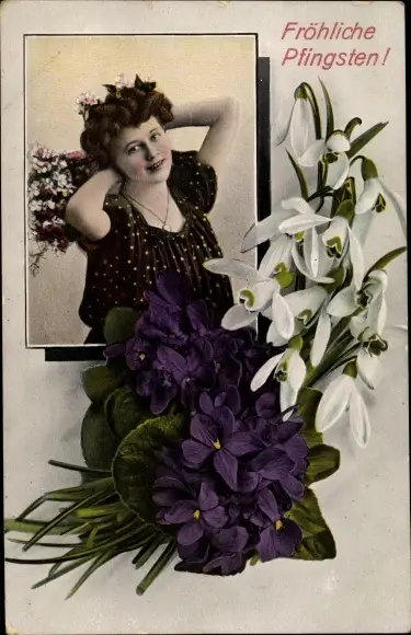 Ak Glückwunsch Pfingsten, Damenportrait, Blumenstrauß