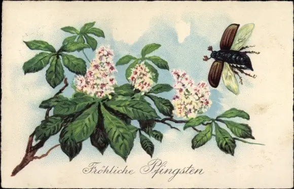 Ak Glückwunsch Pfingsten, Fliegender Maikäfer, Kastanienzweig