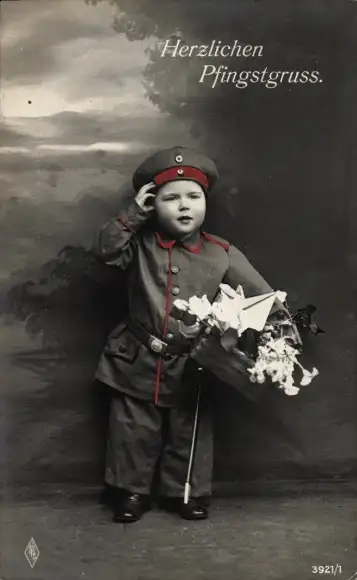 Ak Glückwunsch Pfingsten, Junge in Uniform mit Blumen