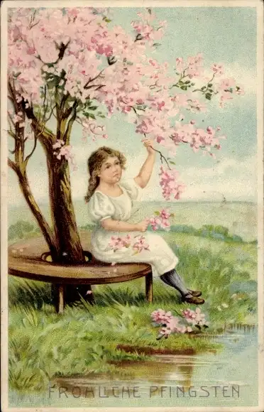 Ak Glückwunsch Pfingsten, Kind, Blühender Baum, Teich