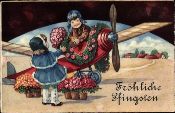 Ak Glückwunsch Pfingsten, Kinder, Blumen, Flugzeug