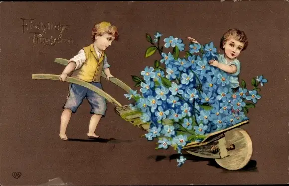 Ak Glückwunsch Pfingsten, Kinder, Schubkarre, Vergissmeinnicht