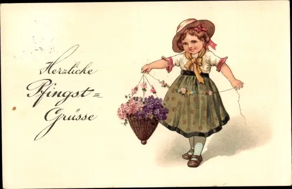 Ak Glückwunsch Pfingsten, Mädchen mit Blumenkorb