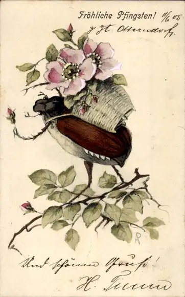 Ak Glückwunsch Pfingsten, Maikäfer, Blumen