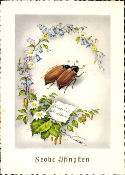 Ak Glückwunsch Pfingsten, Maikäfer, Blumen, Laubblätter