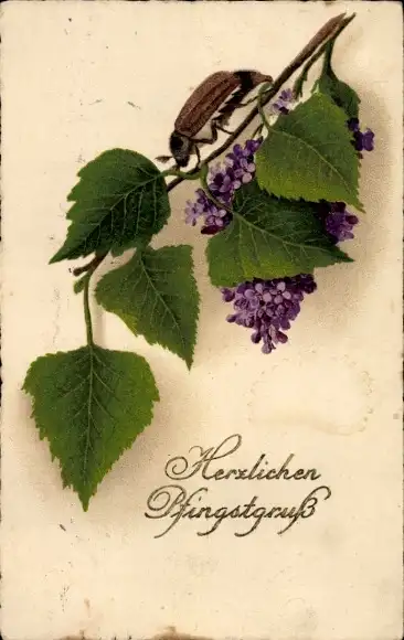 Ak Glückwunsch Pfingsten, Maikäfer, Blumen, Laubblätter