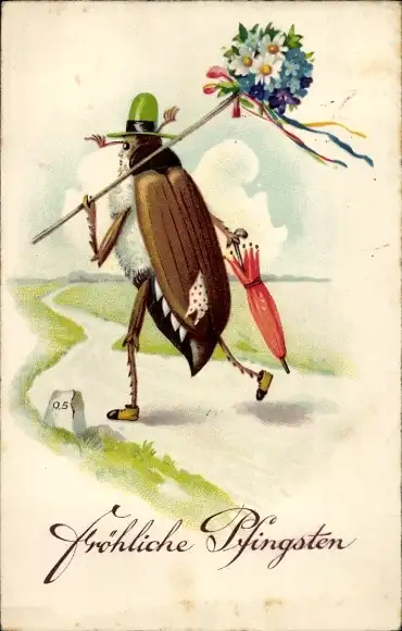 Ak Glückwunsch Pfingsten, Maikäfer, Blumen, Sonnenschirm