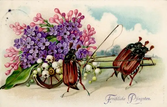 Ak Glückwunsch Pfingsten, Maikäfer, Karren, Blumen, Maiglöckchen