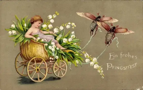 Ak Glückwunsch Pfingsten, Maikäfer, Kutsche, Maiglöckchen