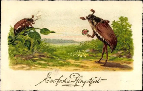 Ak Glückwunsch Pfingsten, Maikäfer, Laubblätter