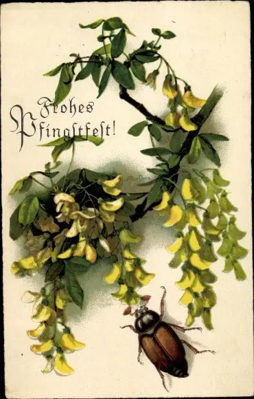 Ak Glückwunsch Pfingsten, Maikäfer, Zweig mit gelben Blüten