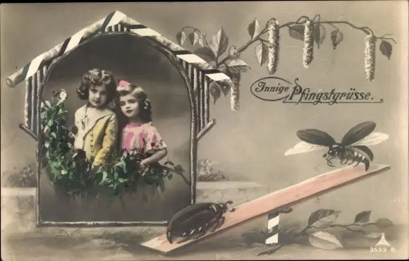 Ak Glückwunsch Pfingsten, Maikäfer auf einer Wippe, Kinder, Birkenzweig
