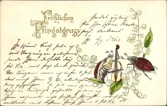Ak Glückwunsch Pfingsten, Maikäfer mit Cello, Maiglöckchen