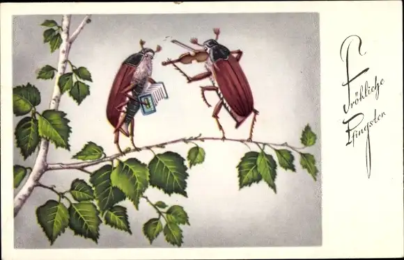Ak Glückwunsch Pfingsten, Musizierende Maikäfer, Geige, Harmonika