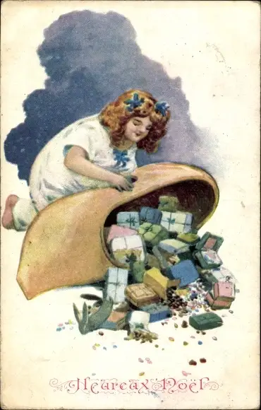 Ak Glückwunsch Weihanchten, Mädchen mit Geschenken