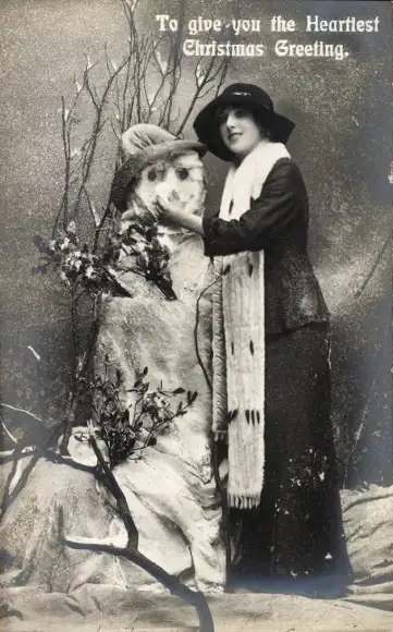 Ak Glückwunsch Weihnachten, Frau mit Schneemann