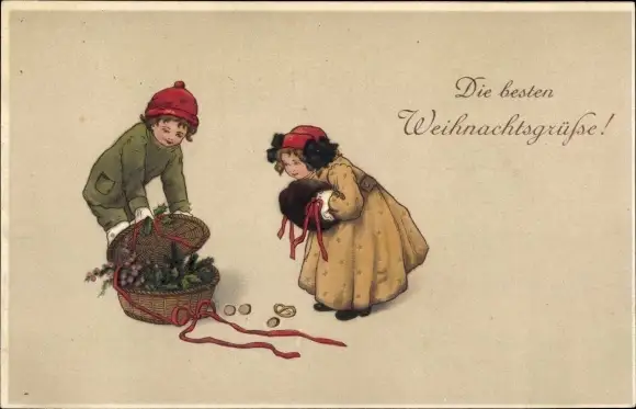 Ak Glückwunsch Weihnachten, Junge und Mädchen mit Weidenkorb