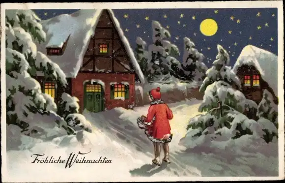 Ak Glückwunsch Weihnachten, Ortschaft im Winter, Mädchen, Mondschein