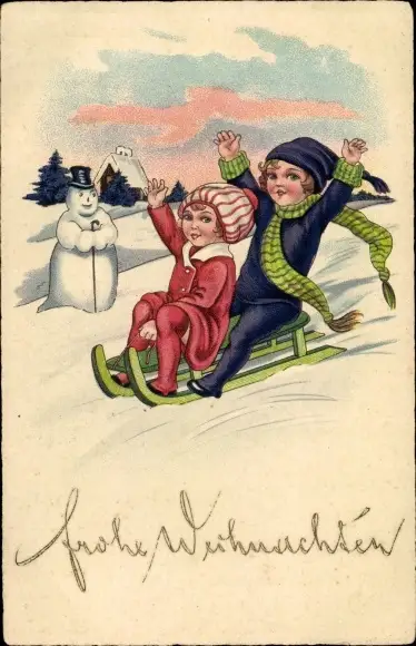 Ak Glückwunsch Weihnachten, Schlittenfahrt, Kinder, Schneemann