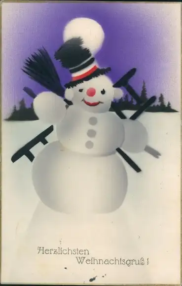 Ak Glückwunsch Weihnachten, Schneemann im Mondschein