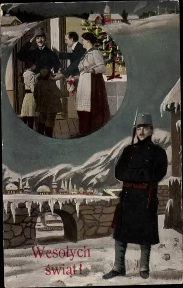 Ak Glückwunsch Weihnachten, Wesolych swiat, Soldat in Uniform, Tannenbaum