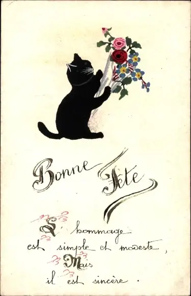 Ak Glückwunsch, schwarze Katze mit Blumenstrauß