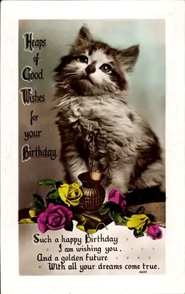 Ak Glückwunsch zum Geburtstag, junge Katze, Rosen