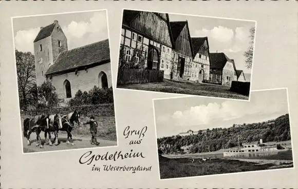 Ak Godelheim Höxter an der Weser, Fachwerkhäuser, Dampfer, Pferde