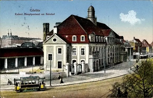 Ak Görlitz in der Lausitz, Kaiserliches Hauptpostamt am Bahnhof, Straßenbahn