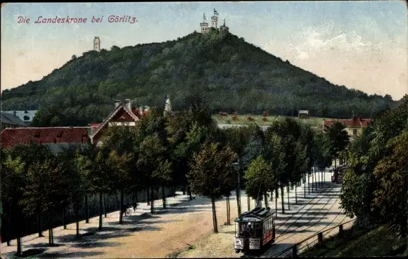 Ak Görlitz in der Lausitz, Landeskrone, Straßenbahn