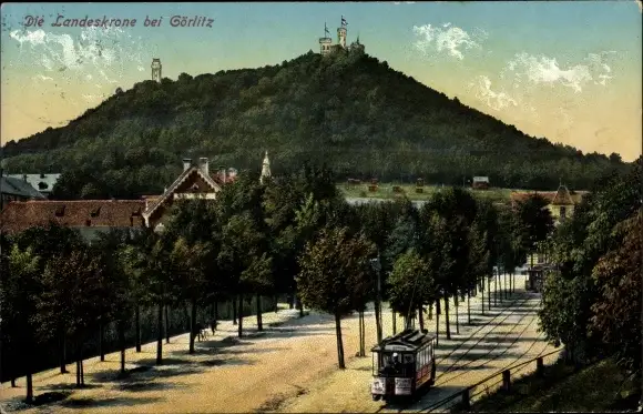 Ak Görlitz in der Lausitz, Landeskrone, Straßenbahn