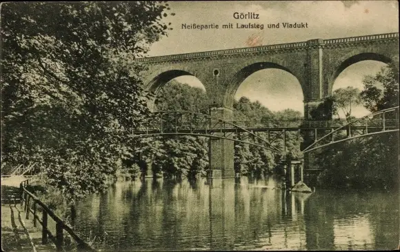 Ak Görlitz in der Lausitz, Neißepartie mit Laufsteg und Viadukt