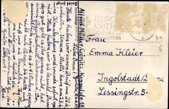 gelaufen 1949, Briefmarke entfernt, rückseitig Klebereste, sonst guter Zustand