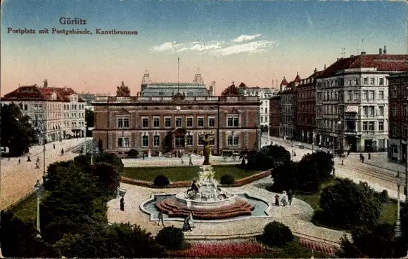 Ak Görlitz in der Lausitz, Postplatz, Postgebäude, Kunstbrunnen