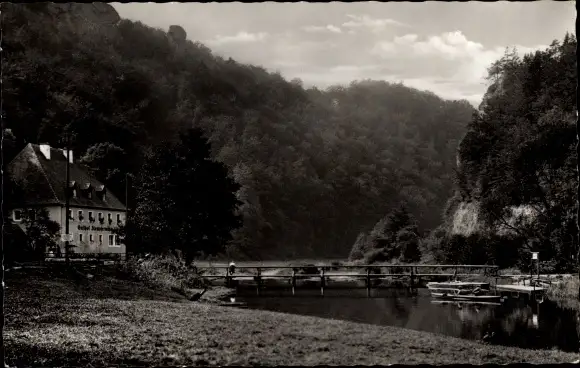Ak Gößweinstein in Oberfranken, Gasthof Pension Stempfermühle, Flusspartie