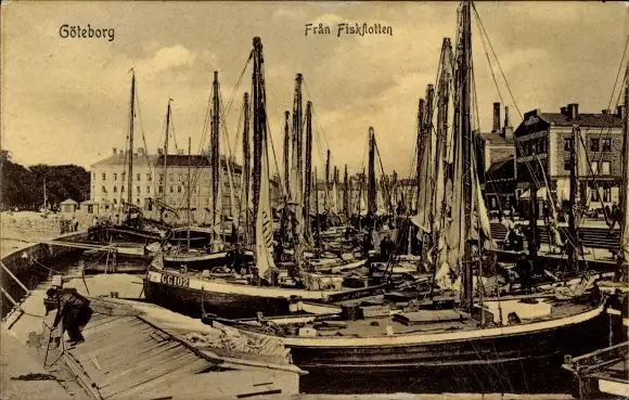 Ak Göteborg Schweden, Boote, Från Fiskflotten, Häuser im Hintergrund