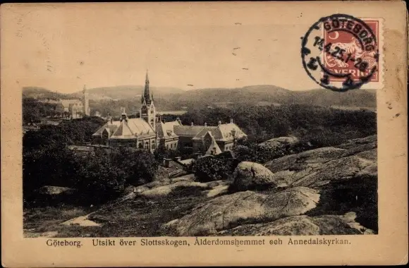 Ak Göteborg Schweden, Utsikt över Slottsskogen, Alderdomshemmet och Annedalskyrkan
