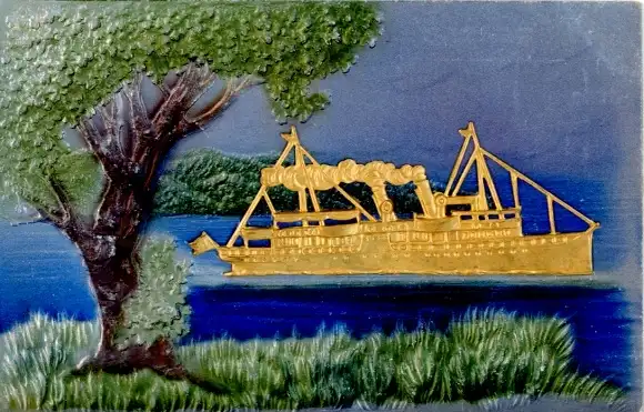 Ak Goldenes Dampfschiff, See, Baum, Kitsch