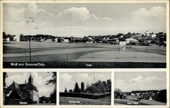 Ak Gommla Greiz in Thüringen, Ehrenmal, Kirche, Totalansicht