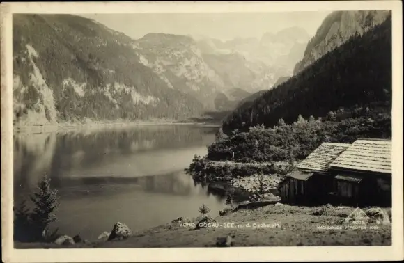 Ak Gosau in Oberösterreich, See, Dachstein, Holzhütte