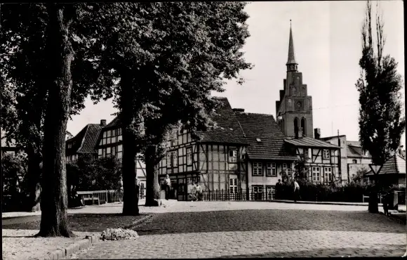 Ak Grabow an der Elde in Mecklenburg, Blick auf den Steindamm, Kirchturm