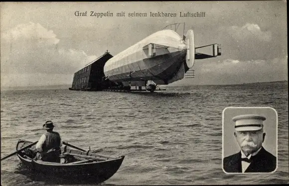Ak Graf Zeppelin mit seinem lenkbaren Luftschiff, Ruderboot, Portrait