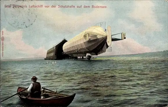 Ak Graf Zeppelin's Luftschiff vor der Schutzhalle auf dem Bodensee