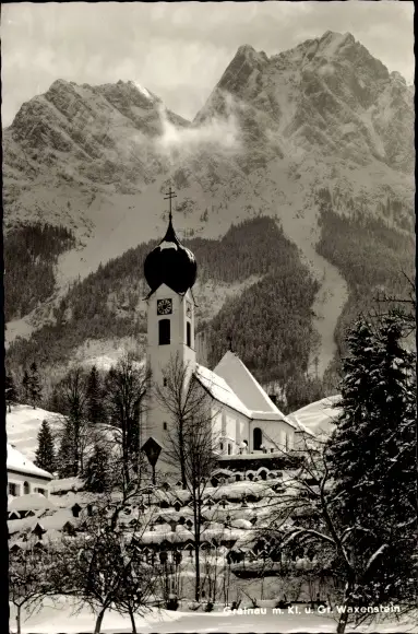 Ak Grainau in Oberbayern, Kleiner u. Großer Waxenstein, Kirche