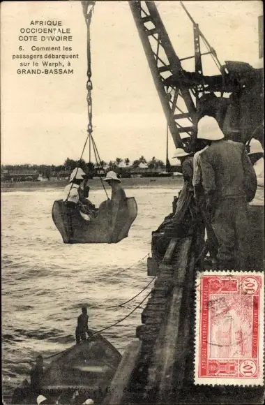 Ak Grand Bassam Elfenbeinküste, Comment les passagers debarquent sur le Warph