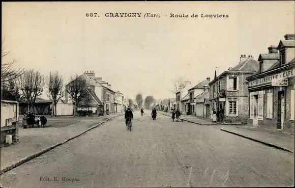 Ak Gravigny Eure, Route de Louviers, Café Mercerie, Épicerie