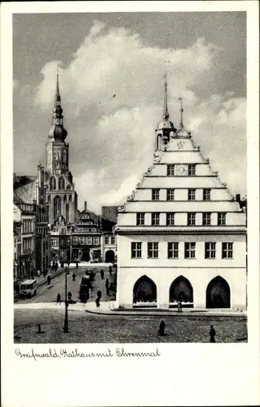 Ak Greifswald in Mecklenburg Vorpommern, Straßenpartie mit Rathaus, Ehrenmal und Kirche