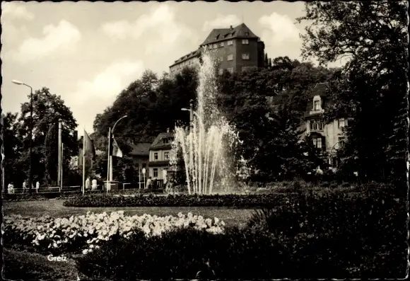 Ak Greiz im Vogtland, Springbrunnen, Platz, Burg
